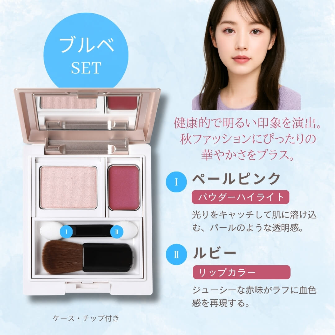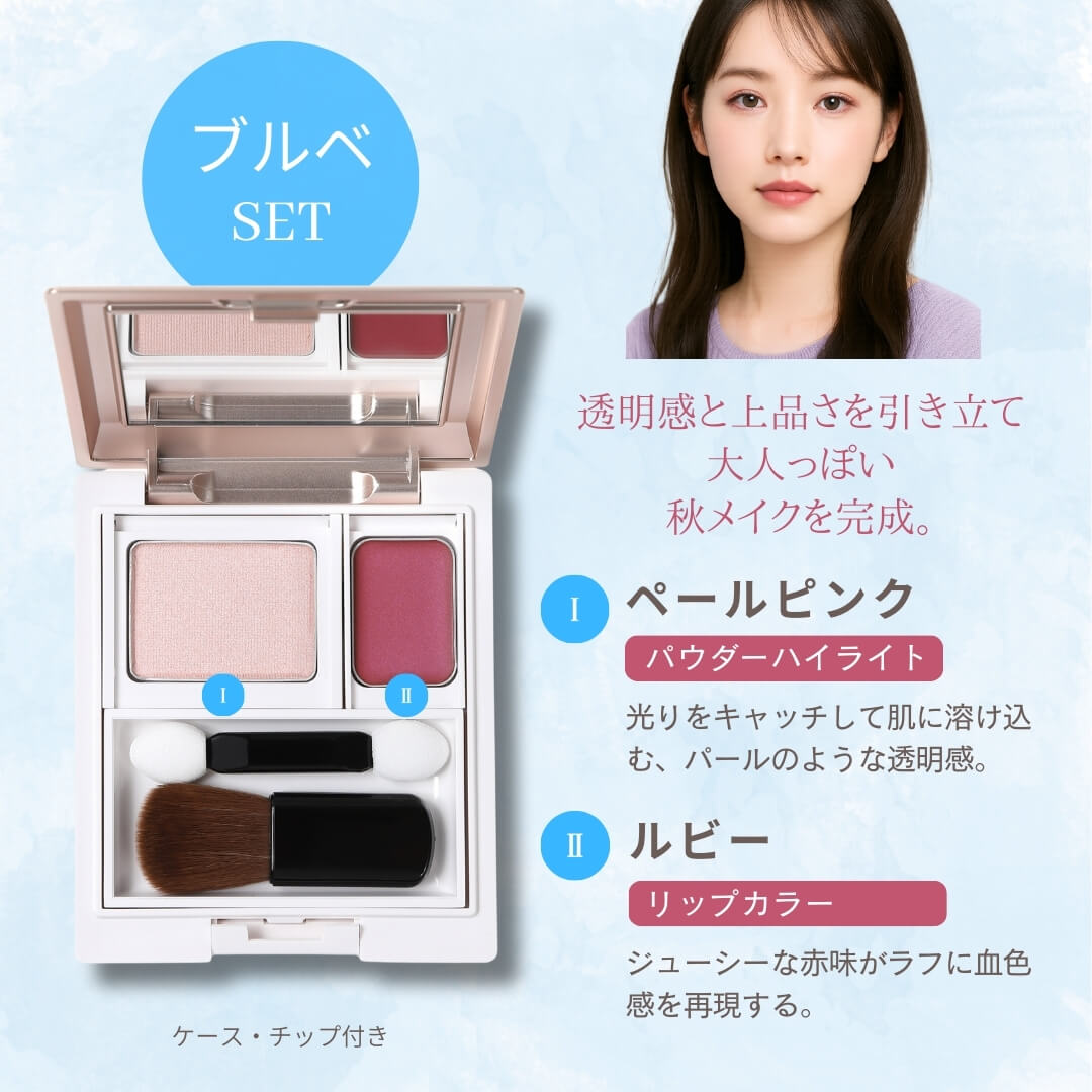 秋のファッションに映えるリップカラー&ハイライトを、特製コンパクトケースにセット。今回は 「イエベに似合うセット」「ブルベに似合うセット」 の2タイプからお選びいただけます。